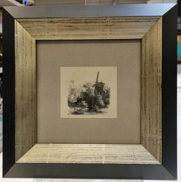 petite gravure non numérotée , vue d’un moulin posé sur fond en Craft dans un cadre baguette large noir et dorée